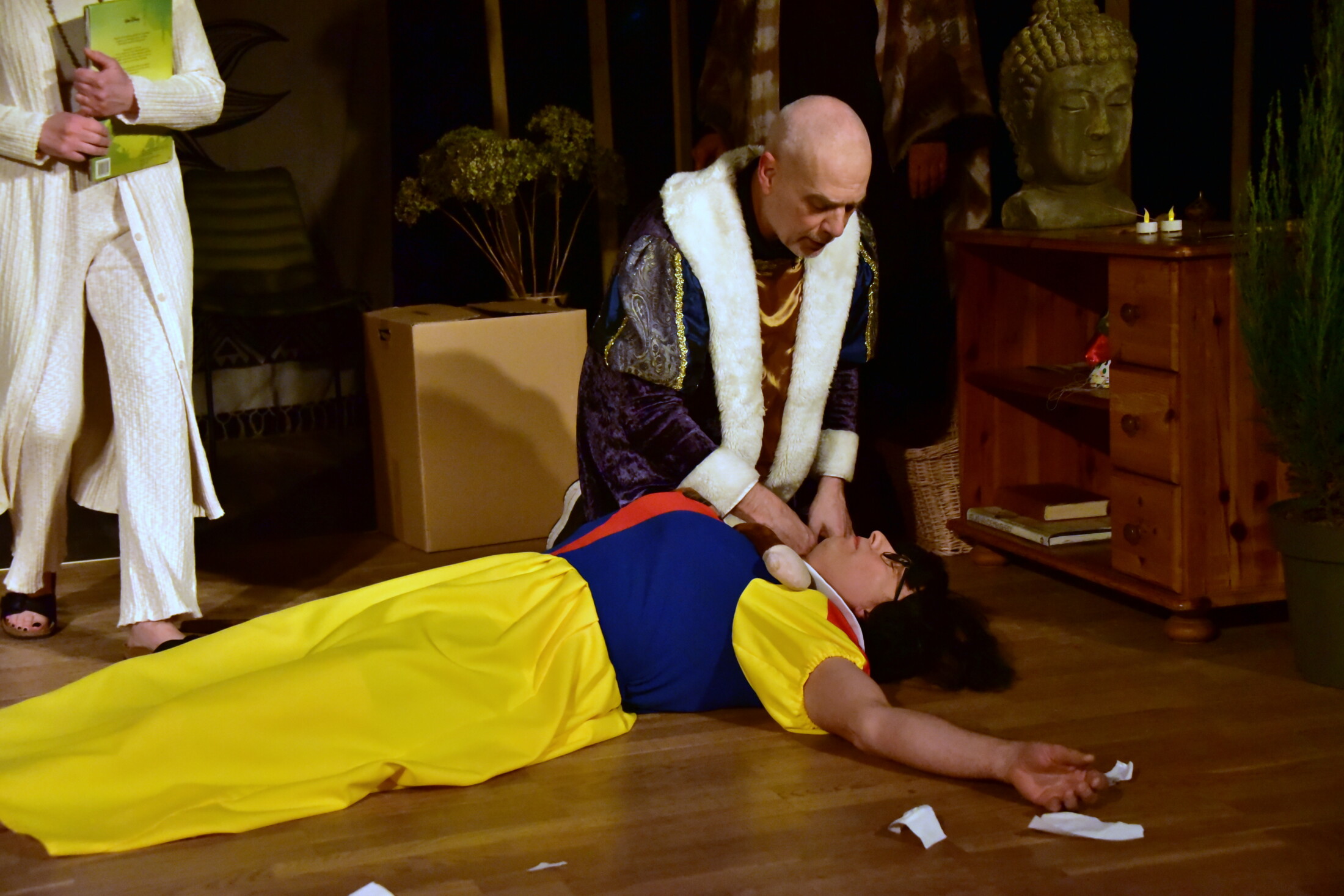 Het valt nog niet me om de voorstelling op de planken te krijgen. Kent iedereen zijn tekst? Zijn de kostuums op tijd aanwezig? Heeft Sneeuwwitje niet te veel drugs gebruikt? Weten de dwergen nog welk mutsje ze op moeten? Wil de prins Sneeuwwitje nog kussen? Kan de boze koningin het allemaal nog wel aan of zij zelf bijna rijp voor opname?
