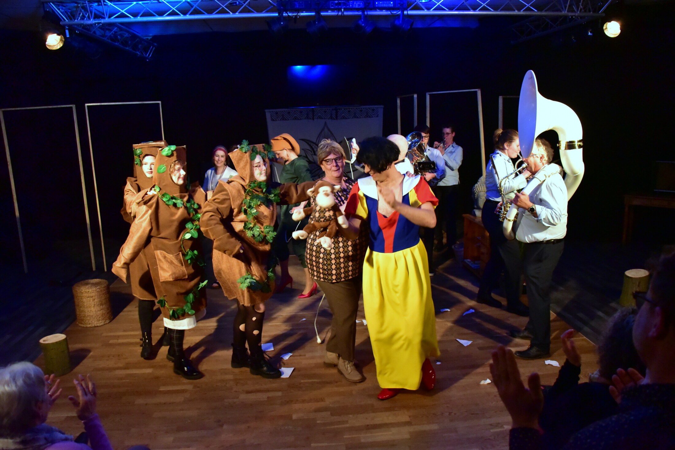 Haar keus is gevallen op het sprookje van ‘Sneeuwwitje’. Niet alleen de cliënten staan op het podium maar ook de andere hulpverleners zijn vriendelijk verzocht om een rolletje mee te spleen. Wat zij met frisse tegenzin doen.